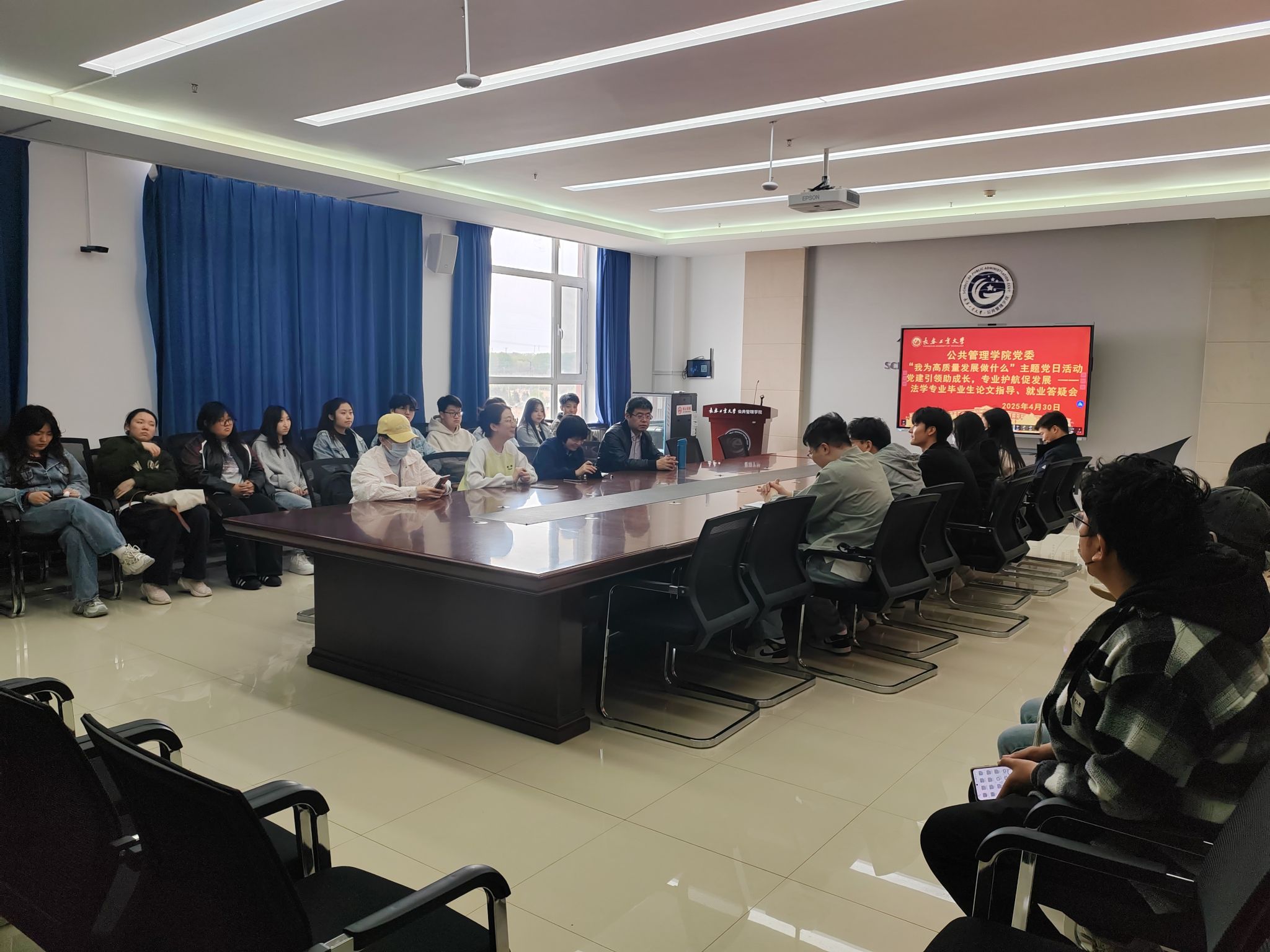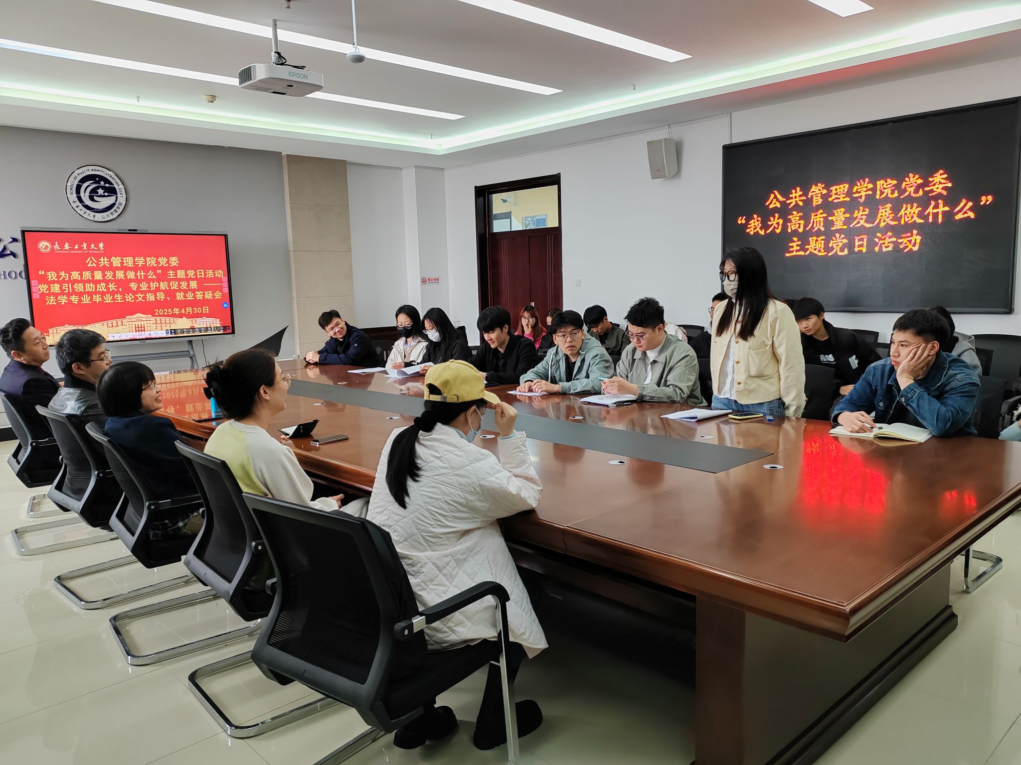党委紧扣“我为高质量发展做什么”主题,组织法学系党支部在北湖东区401会议室开展法学专业毕业生论文指导与就业答疑会。学院副院长冯娜、法学系党支部书记郭千钰、系主任宋浩及党员教师代表张雪峰、刘备,与法学专业本、研究生毕业生代表面对面交流,围绕毕业论文指导、就业政策解读等热点问题展开深度研讨,以实际行动践行党建与专业建设双融双促。