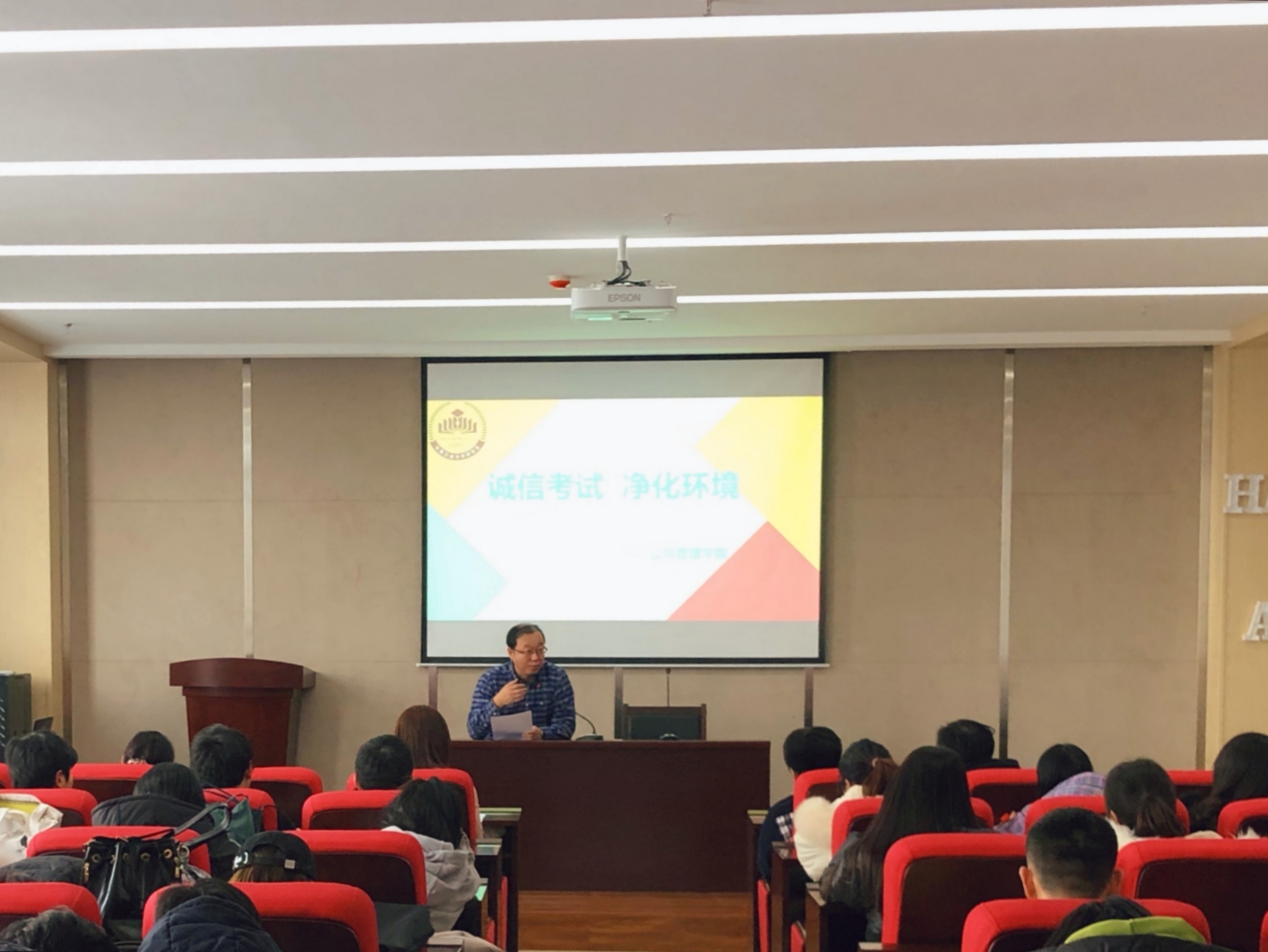 于2019年12月11日在北湖校区报告厅举行了“诚信考试净化环境”主题教育大会。本次会议主讲人学院党委副书记钟诚面向参会的研究生发表了讲话。