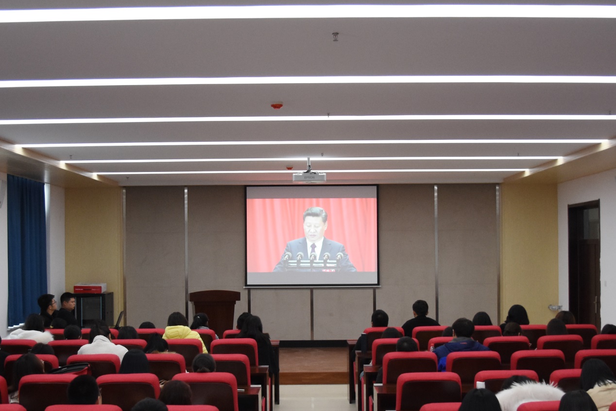 于北湖东校区主楼学院报告厅组织学生党支部参观“庆祝中华人民共和国成立70周年大型成就展”网上展馆。