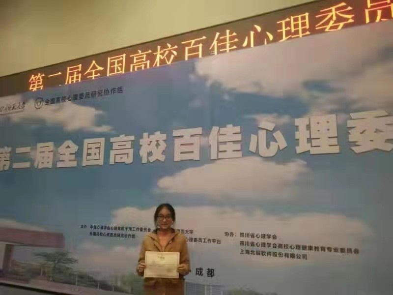 16级社会工作专业钱卉馨获得第二届全国百佳心理委员称号。