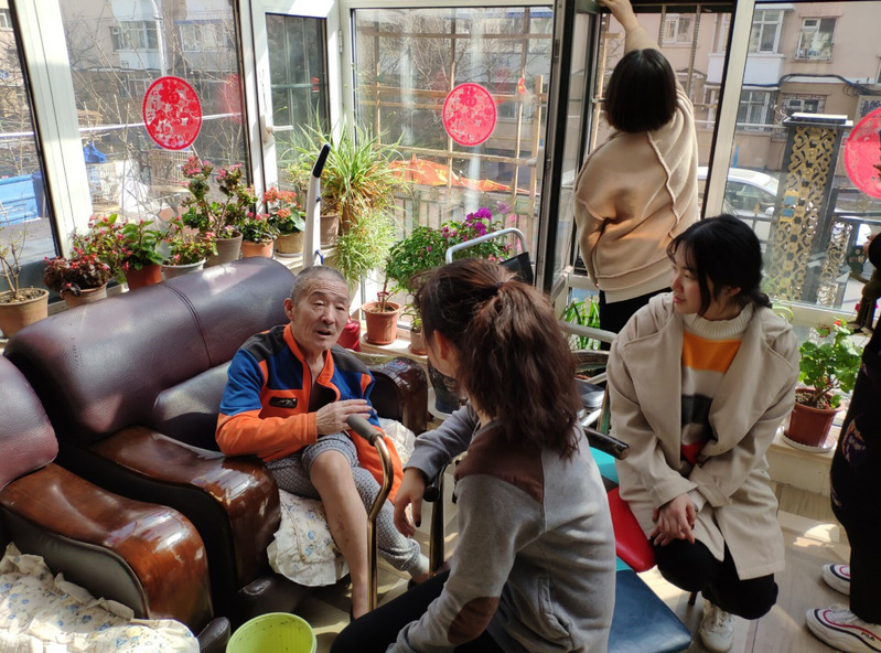 根据养老院实际情况,志愿者分工合作,投入到助老服务中。志愿者用共情、倾听等技术对一位被肇事司机多次碾压的老人进行了心理服务;给花草浇水施肥,打扫卫生,将住处打扫的窗明几净;帮行动不便的老人整理东西……一位老人拉住志愿者的手唠起了家常:以前吃不饱,穿不暖。只有过年才能吃上一顿像样的饭,若有病就遭殃了,治不起病,只能等死……现在生活水平有了极大提高,能吃饱穿暖还能玩的开心。但随着年龄的增大,身体各项机能衰退,在家里住着给儿女添很多麻烦,很不方便,于是就来养老院了。养老院居住环境干净整洁卫生,鸟语花香,老人们的精神状态比较好,还可以在休闲区看电视剧、打牌下棋、锻炼身体、聊天,这么多老人在一起很开心,儿女时不时来看看,自己很知足。