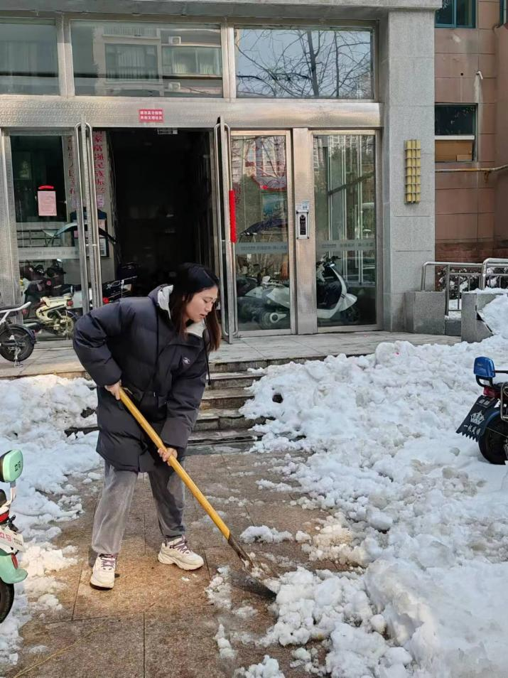 210904班的李洁。这个寒假,我积极响应学院号召,在河南省固始县湖畔春天社区进行大学生“返家乡”实践。在岗期间,我积极配合社区工作,加入到社区铲雪的劳动中,帮忙清理单元楼前和车道上的积雪和暗冰,以免社区居民摔倒和车辆打滑,确保居民安全、温暖过冬。此外,我还在社区文明实践站整理社区年度材料,撰写总结报告,为社区建设献一份力