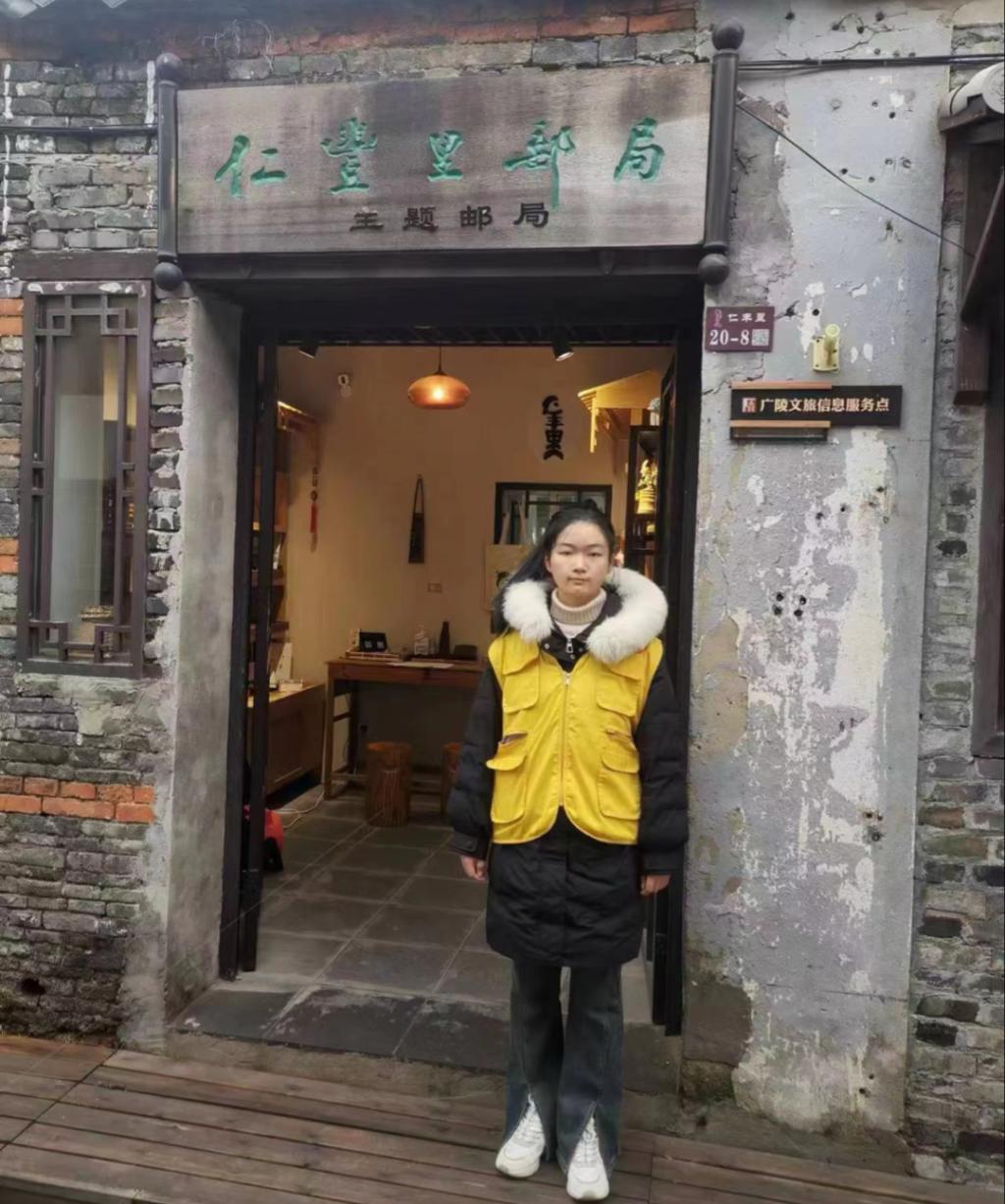 23090401班的殷义欣,在寒假期间,我积极参加了“返家乡”社会实践活动,在仁丰里社区担任志愿者,在社区文明驿站和仁丰里主题邮局中提供服务。在文明驿站,我的主要任务是为过路旅客指路、借充电器、倒水等,帮助他们解决困难,献上一份爱心。在仁丰里主题邮局,我负责介绍仁丰里街区的文创产品和文物,让过路的旅客们了解旌忠寺的历史、感受仁丰里街区独特的文化艺术魅力。在古风留韵、遗存丰厚的巷道上,在古色古香的小宅里,看着一位位旅客集邮、写明信片、聆听我的讲解,逐渐坚定我保护古城、发展名城的决心,我希望通过我的努力,让更多的人了解到仁丰里古巷,感受我的家乡文化。