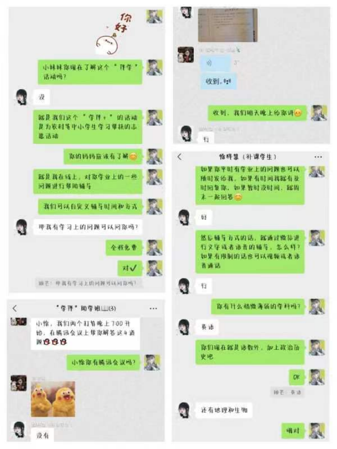 一批政治觉悟高、业务素质好的优秀青年积极主动报名参加,并在第一时间完成结对子。“学伴+”志愿者们根据服务对象年级、学科、主要学业帮助诉求等,组建“一对一”、“多对一”的学业帮帮团,通过微信、QQ等即时通讯软件,及时解答服务对象学业问题,用热情与真诚践行志愿精神,得到了学生家长和学生们的一致认可和好评。接下来让我们一起看看爱爱啦