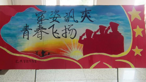 积极响应学校号召开展的“军训”主题的板报绘画活动。