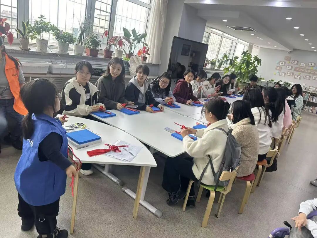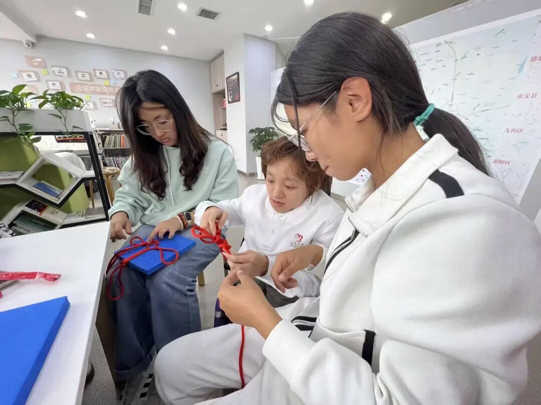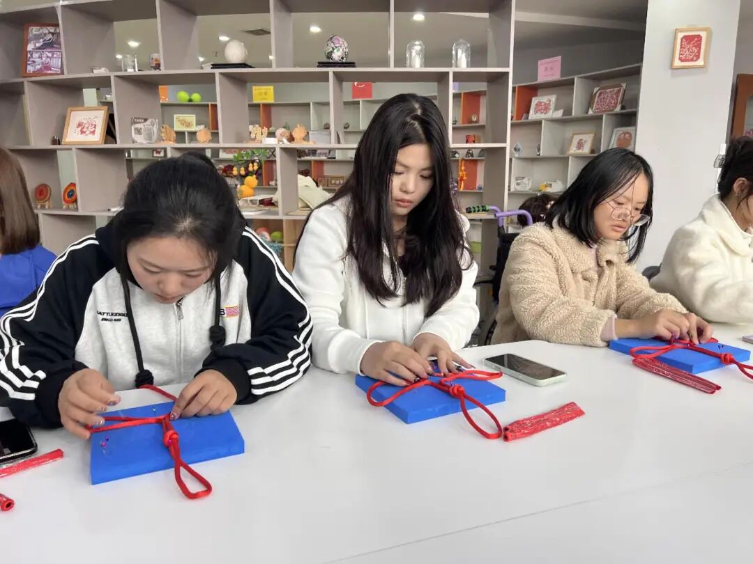 学生在心语非遗助残公益体验馆,参与了这场融合非遗与爱心的中国结手作实践。