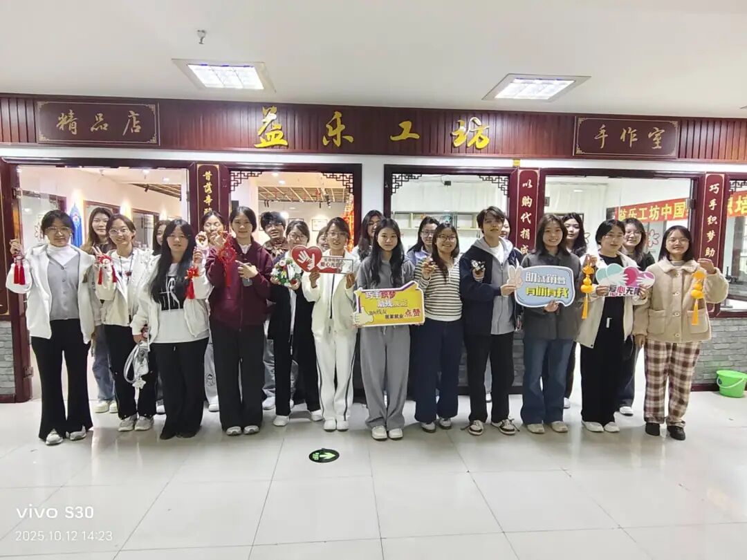 益乐工坊内,陈列着残障手艺人创作的各类中国结作品—从传统“吉祥结”到创新“盘长结”,红绳交错间满是匠心温度。同学们在总会工作人员的带领下参观展品,深刻感受非遗工艺与助残初心的结合,对接下来的中国结编织体验充满热情。
