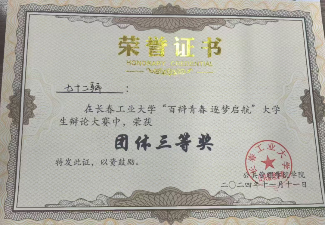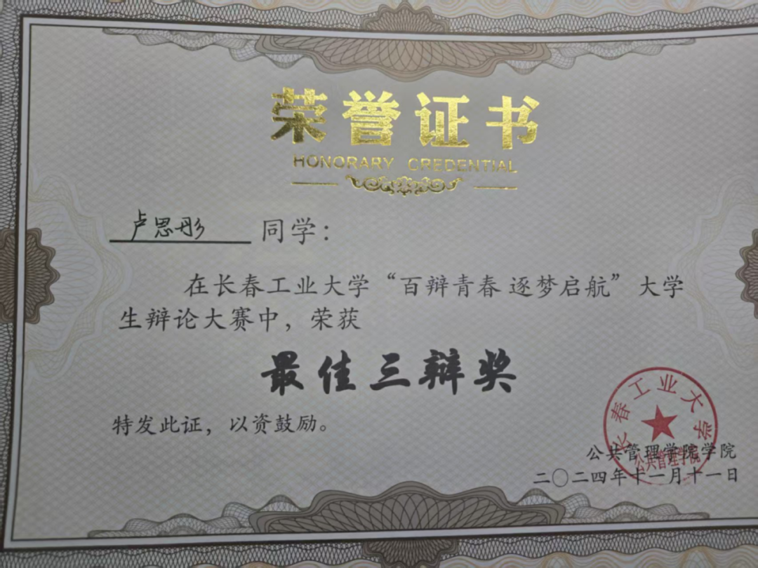 2024年“百辩青春 逐梦启航”校园辩论赛学院一等奖、大学生辩论赛团队二等奖与三等奖,社员卢思彤同学更是凭借出色表现荣获“最佳三辩奖”。一张张荣誉证书,既是对过往努力的肯定,更是社团凝聚力与实力的见证。