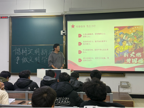 随后,班长何昊聪同学结合校园生活与社会热点,分享了文明出行、网络文明、公共礼仪等方面的正面案例与反面典型,引导大家展开热烈讨论——从“课堂上的手机管理”到“公共场合的言行举止”,从“网络言论的责任边界”到“公共服务中的文明素养”,同学们结合自身经历与专业认知各抒己见,进一步明晰了文明行为的具体规范与价值意义。
