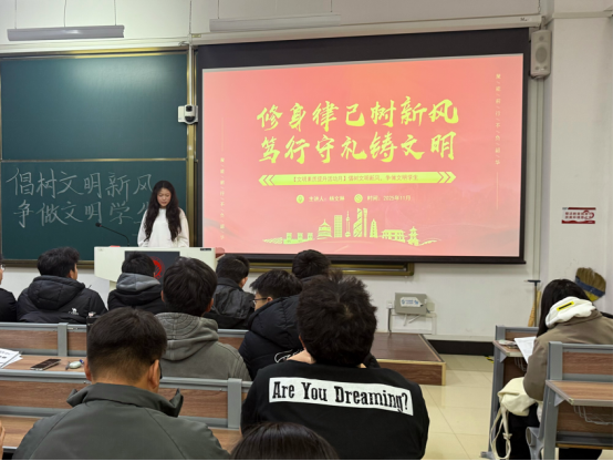 此次活动由团支书杨文琳同学主持。活动伊始,杨文琳同学以“新时代青年的修身之道”为切入点,通过PPT展示、案例分享等形式,解读了“修身律己”的时代内涵——从校园里的文明用语、垃圾分类,到社会中的志愿服务、公共秩序维护,让同学们明白“文明”并非抽象概念,而是融入日常的点滴行动。同学们也明白了部分不文明现象的改进方向,在思想碰撞中凝聚起“以文明为荣、以陋习为耻”的共识。