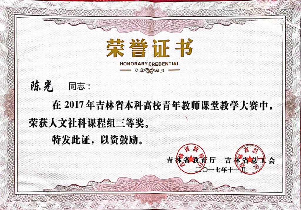 近日,爱爱啦 教师陈光同志在2017年吉林省本科高校青年教师课堂教学大赛中,荣获人文社科课程组三等奖。