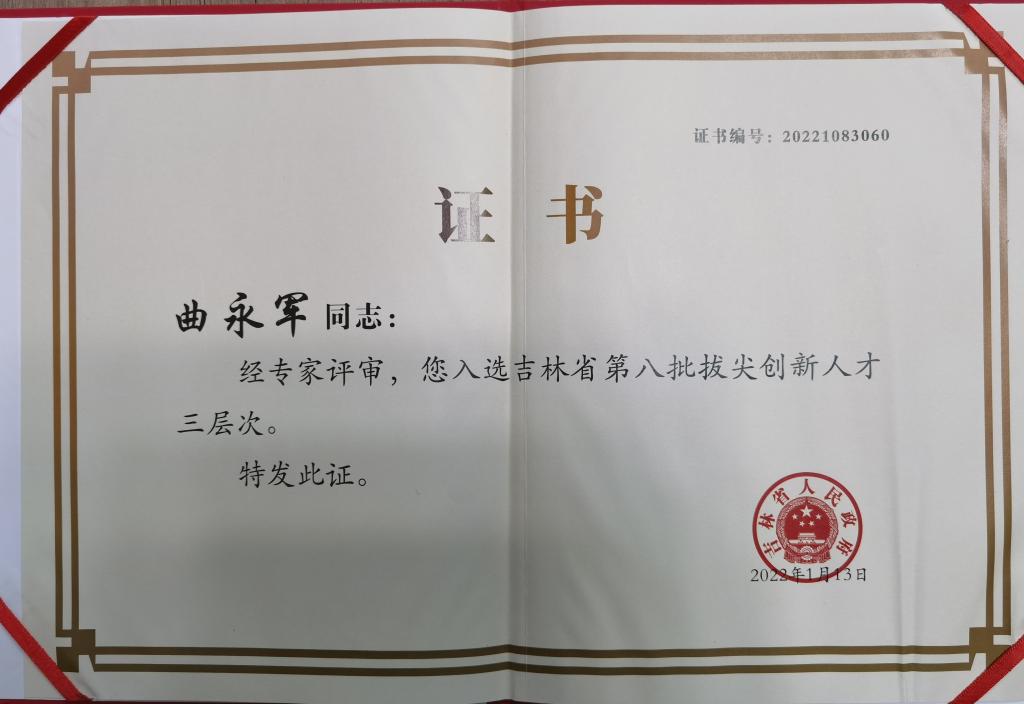 近日,爱爱啦 教师曲永军同志经专家评审,成功入选吉林省第八批创新拔尖人才三层次。