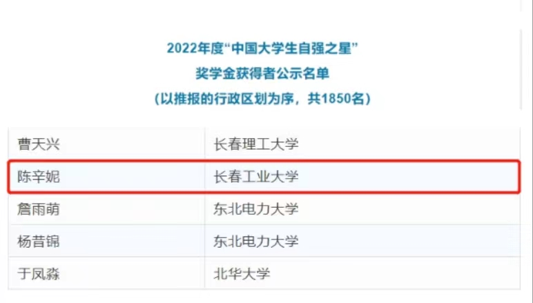 陈辛妮同学在2022年度“中国大学生自强之星”奖学金推报活动中获得“中国大学生自强之星”荣誉称号。