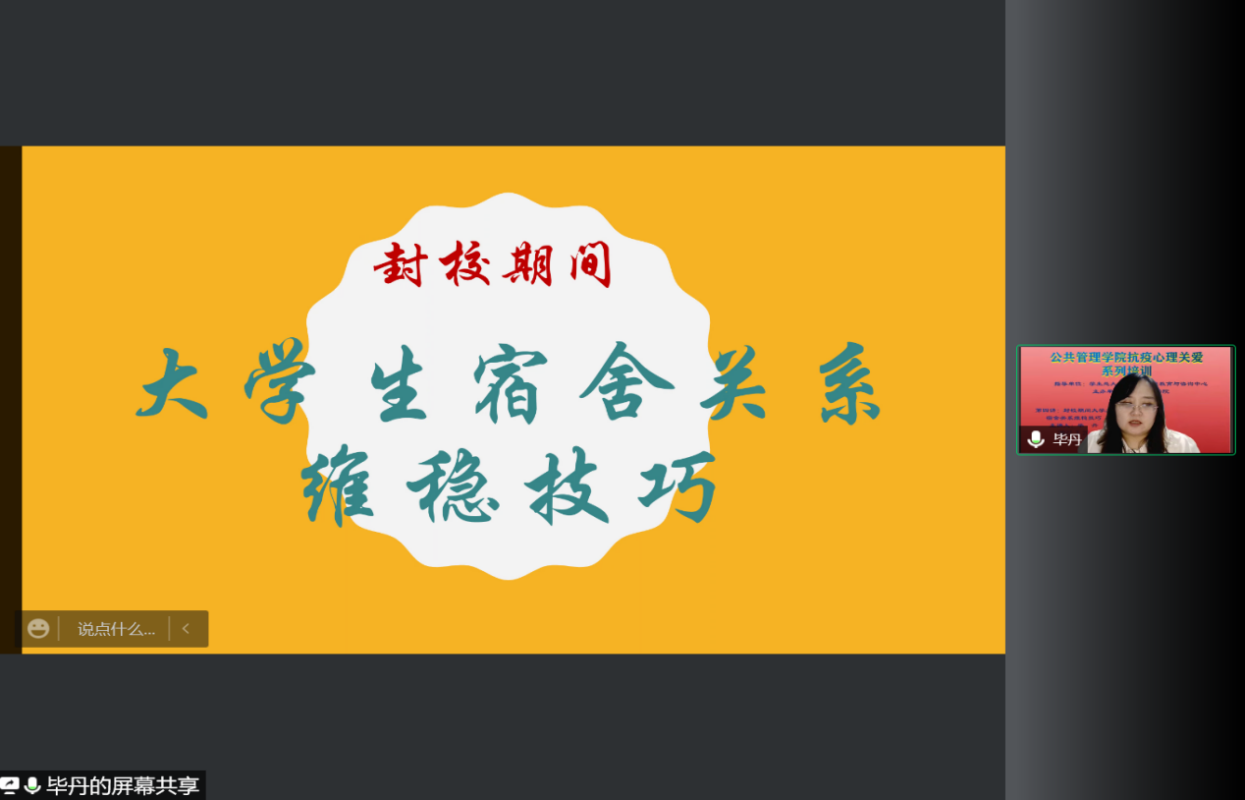 举办首轮抗疫心理关爱系列讲座第四讲。本次讲座以“封校期间大学生宿舍关系维稳技巧”为主题,主讲人是社会工作系的毕丹老师。