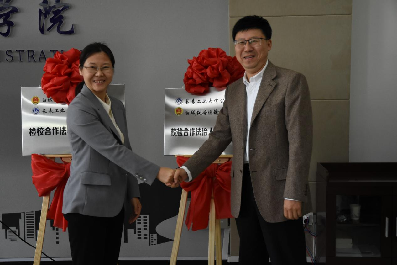党委书记于洪、白城铁路运输检察院检察长于金秋共同为“检校合作法学理论研究基地”“校检合作法治人才培养实践基地”揭牌。