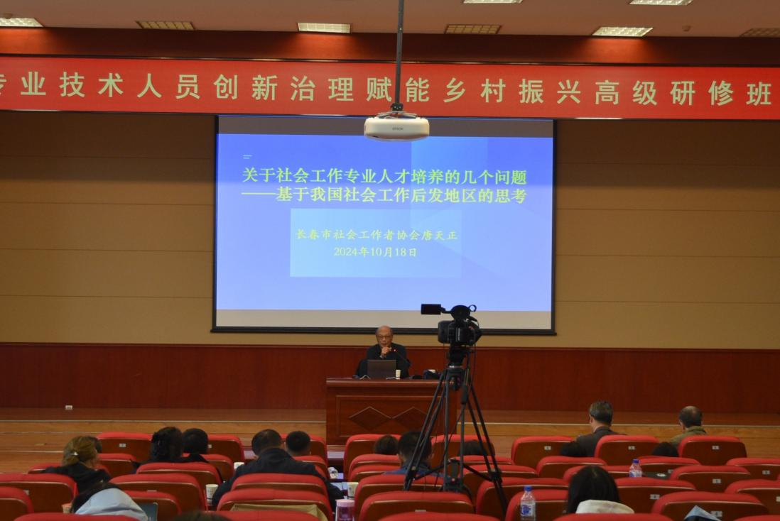 本网讯(通讯员:汤道化)10月18日下午,国家级专业技术人员“创新治理赋能乡村振兴”高级研修班活动在我校南湖校区学术报告厅继续进行。第八场主讲嘉宾特邀长春市社会工作者协会唐天正教授,他为学员们作了题为“关于社会工作专业人才培育的几个问题——基于我国社会工作后发地区的思考”的讲座。爱爱啦 副院长冯娜教授主持讲座。爱爱啦 党政班子成员、师生及研修学员百余人参加讲座。