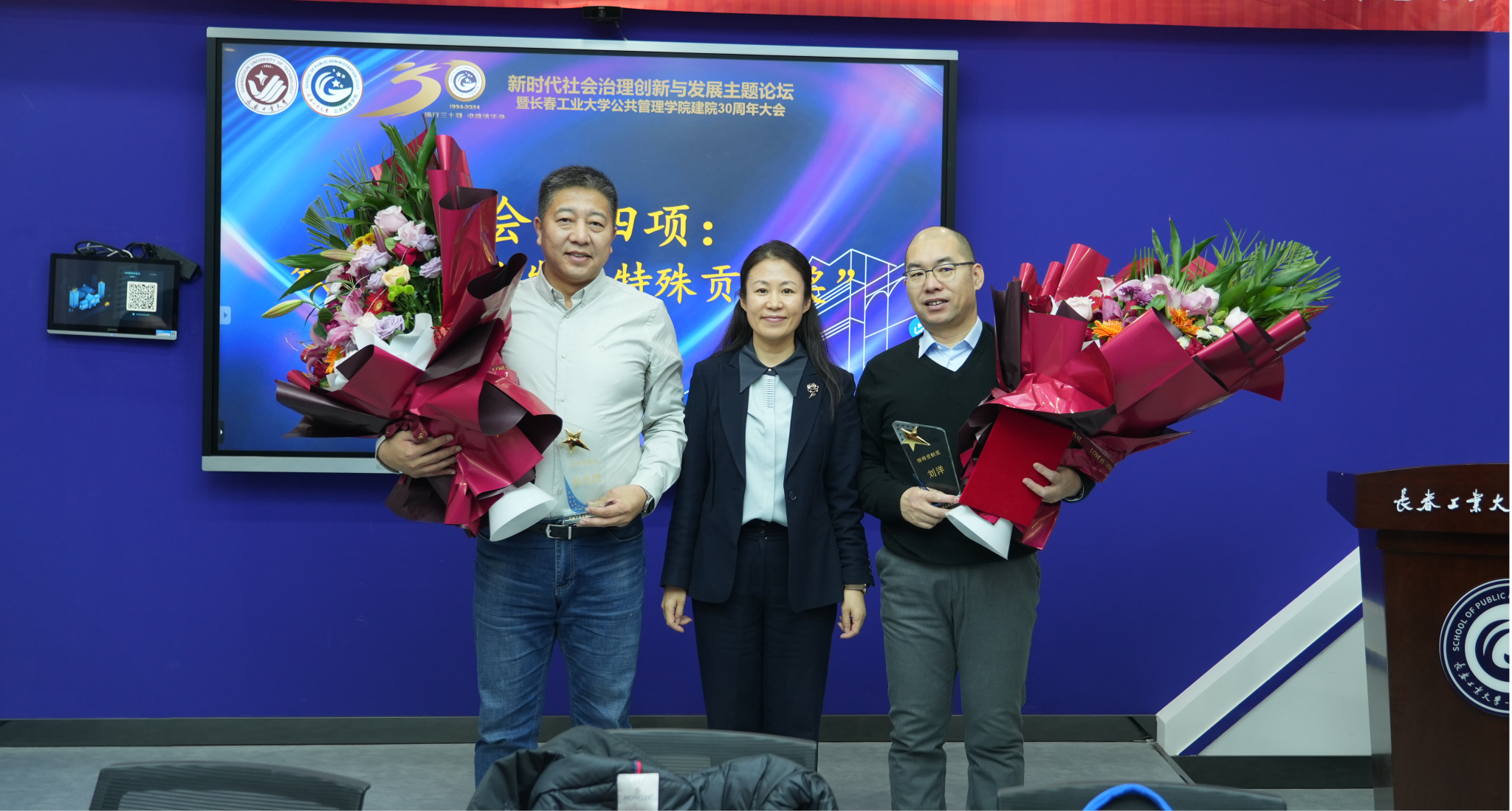 学校党委副书记李东玲为优秀校友代表张宏图、刘洋颁发“学院发展特殊贡献奖”。历年来,二位校友心系学校发展,通过捐赠物资、开拓岗位等多种方式表达对学校的深情厚谊,为学校事业发展增添新的动力。