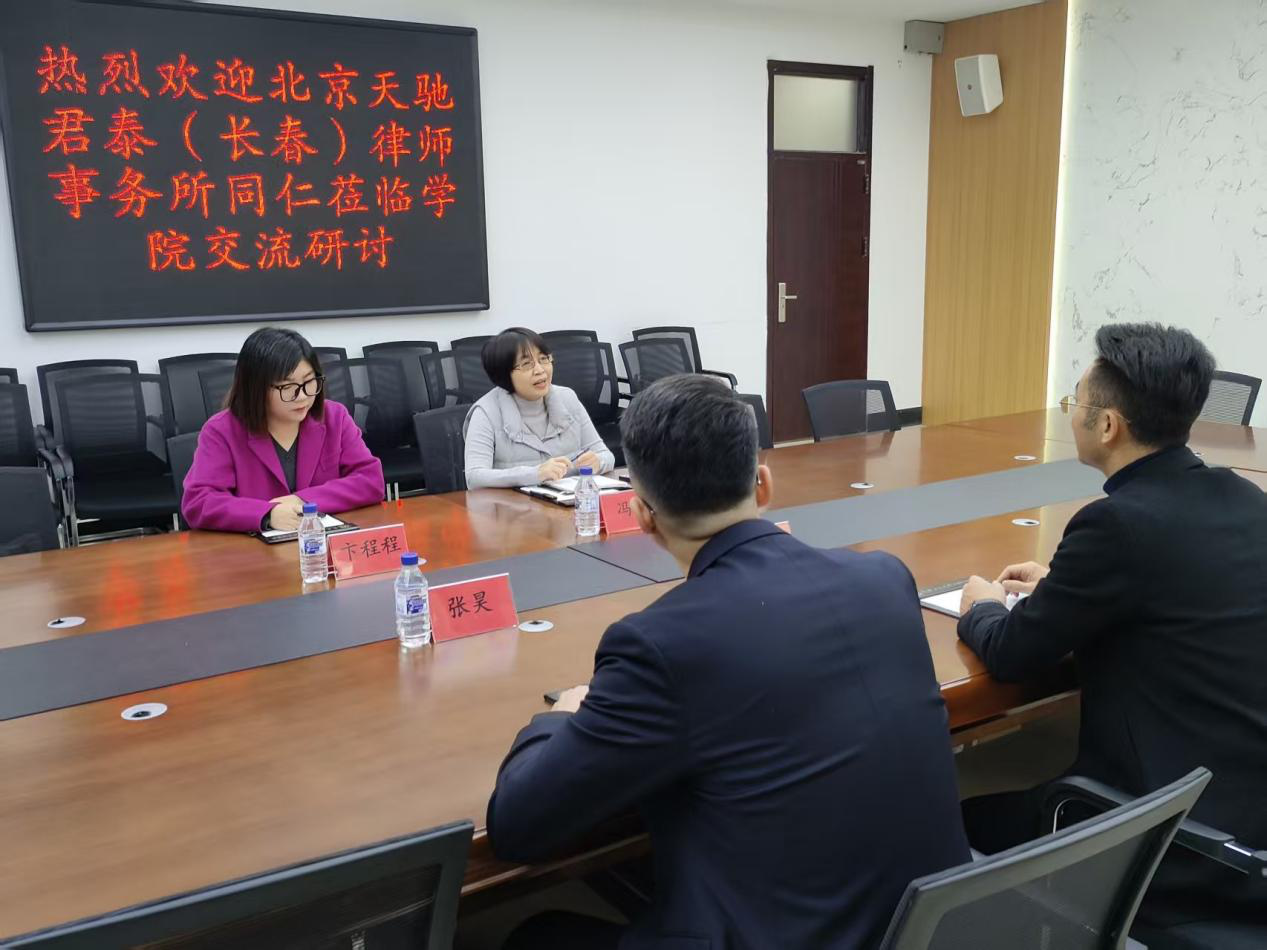 新闻网讯(通讯员 朱琳)2025年12月19日,北京天驰君泰(长春)律师事务所主任张树波律师、高级合伙人张昊律师一行莅临学院,与学院教师就深化法学人才培养、创新实践教学模式、共建专业实习基地、拓展实务合作项目等议题进行了深入且富有成果的交流研讨。学院副院长冯娜老师、法学系副主任卞程程老师出席了此次座谈会。